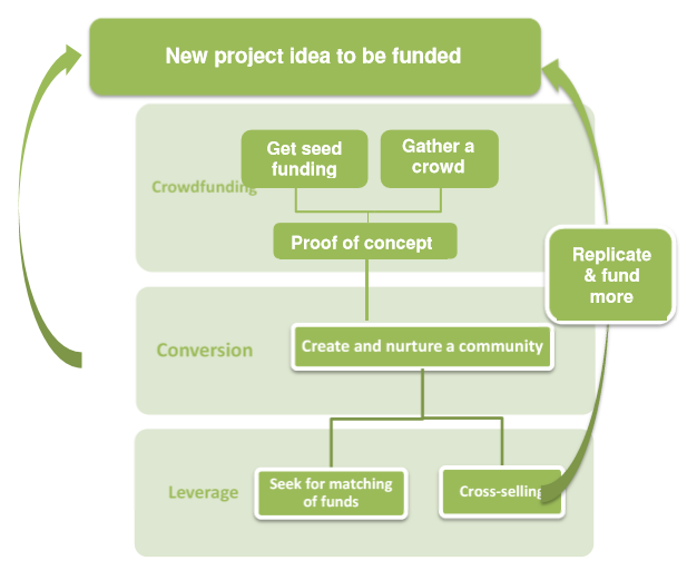 Once you have a community you can apply a long term sustainable funding model that: uses the proof of concept and the community to get other sources of funding (remember crowfunding is only a small part of your funding mix), cross sell products & experiences to generate revenue and finally replicate your success with new projects.