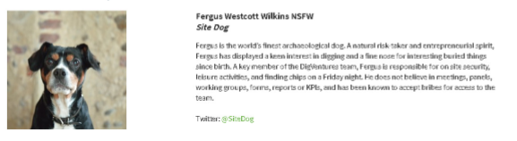 At DigVentures, Fergus the Site Dog is a full part of the team (a mascot dog with his own twitter account!) He brings smiles and apparently quite a few people turn up at events and dig sites especially wanting to meet Fergus.