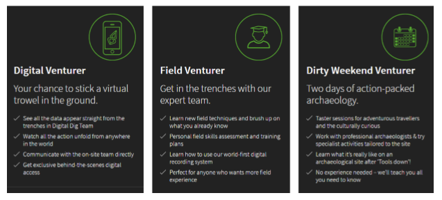 The public that visits your website, Twitter or Facebook account is often interested in your activity and looking for possibilities to get involved. Selling your products and services to them is a great way to recruit more members for your community as well as generate an additional income for covering your costs. DigVentures, for example, offers digging experiences for periods of 1 day to two weeks.
